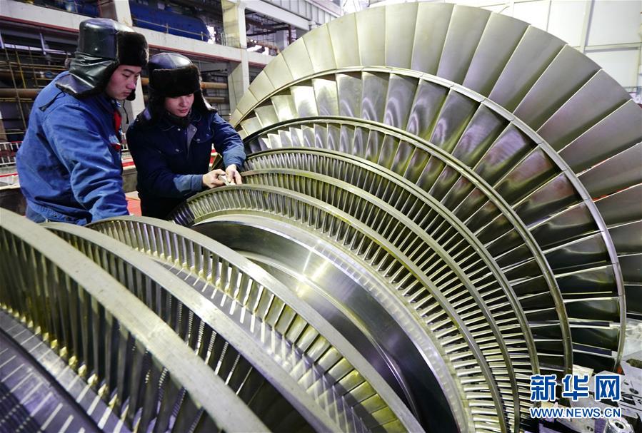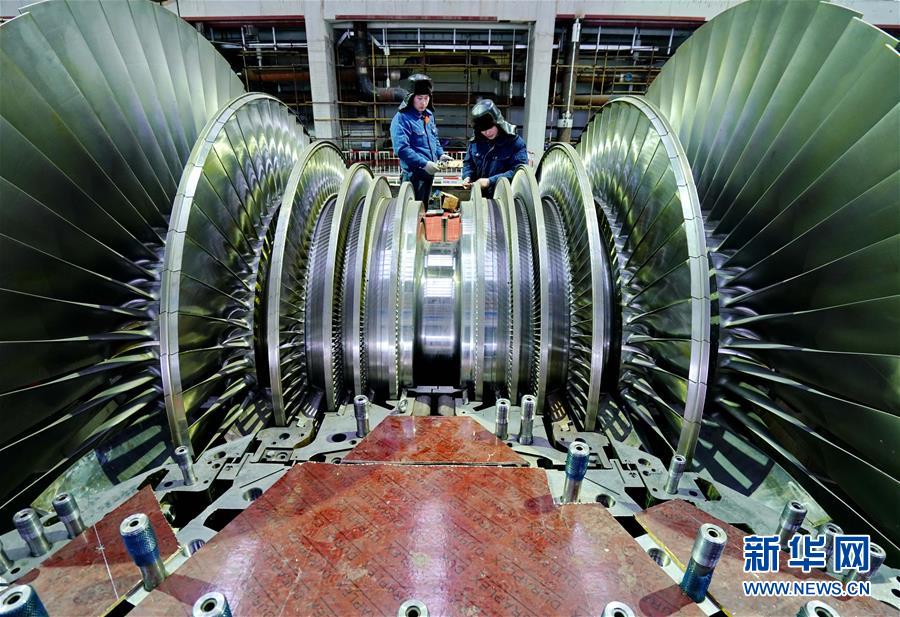 工人在唐山市曹妃甸工業(yè)區(qū)華潤電廠二期工程工地安裝1000MW超超臨界燃煤發(fā)電機(jī)組設(shè)備(1月27日攝)。