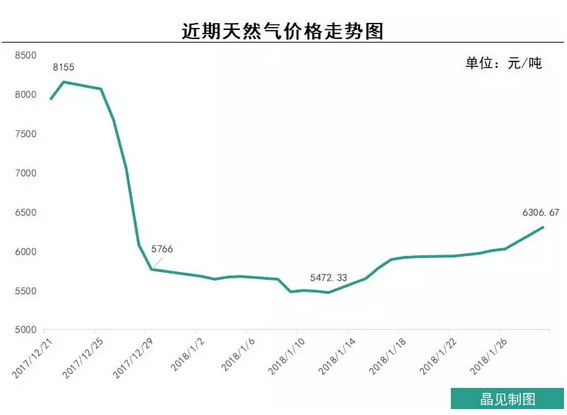 前段時間因為氣荒現(xiàn)象,天然氣價格一路飆升,2017年12月18日,天然氣價格一度飆升至1 2萬元 噸。2017年12月22日,天然氣價格8155元 噸;2018