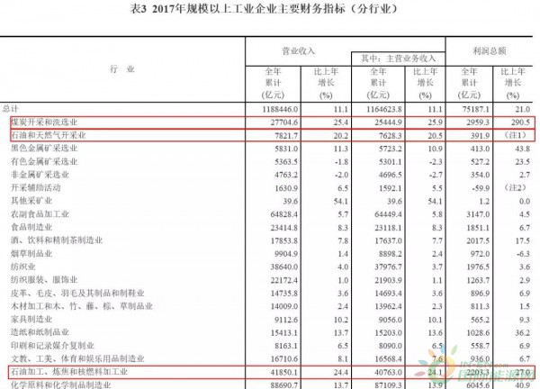 2017年,在41個工業(yè)大類行業(yè)中,37個行業(yè)利潤總額比上年增加,1個行業(yè)持平,3個行業(yè)減少。主要行業(yè)利潤情況如下:煤炭開采和洗選業(yè)利潤總額比上年增長2.9倍,農副食品加工業(yè)增長4.5%,紡織業(yè)增長3.6%,石油加工、煉焦和核燃料加工業(yè)增長27%,化學原料和化學制品制造業(yè)增長40.9%,非金屬礦物制品業(yè)增長20.5%,黑色金屬冶煉和壓延加工業(yè)增長1.8倍,有色金屬冶煉和壓延加工業(yè)增長28.6%,通用設備制造業(yè)增長13.5%,專用設備制造業(yè)增長29.3%,汽車制造業(yè)增長5.8%,電氣機械和器材制造業(yè)增長5.2%,計算機、通信和其他電子設備制造業(yè)增長22.9%,石油和天然氣開采業(yè)由同期虧損轉為盈利,電力、熱力生產和供應業(yè)利潤總額比上年下降15.4%。
