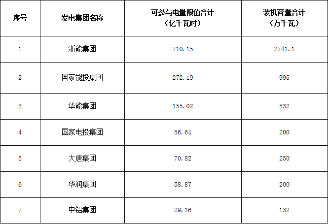 享有優(yōu)先發(fā)電權(quán)的發(fā)電企業(yè),參與本次試點(diǎn)電量(省內(nèi)發(fā)電企業(yè)為上網(wǎng)電量,省外發(fā)電企業(yè)為送我省落地電量,下同)計(jì)297.79億千瓦時(shí),具體名單和參與試點(diǎn)電量詳見附件1。其他發(fā)電企業(yè)參與本次試點(diǎn)電量限值計(jì)1435.11億千瓦時(shí),具體名單和可直接交易電量限值詳見附件2。各發(fā)電集團(tuán)燃煤電廠(不含未正式明確送我省電量的機(jī)組),參與本次試點(diǎn)電量限值及裝機(jī)容量詳見附件3。