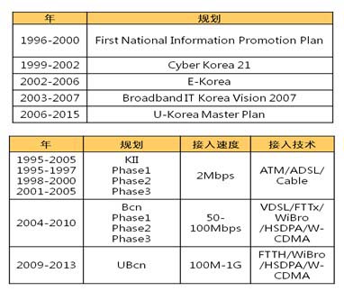 韓國政府是制定國家寬帶規(guī)劃和成功執(zhí)行規(guī)劃的表率。韓國的寬帶規(guī)劃隸屬于國家信息化規(guī),國家信息化規(guī)劃重要的階段包括Cyber Korea 21,e-Korea,U-Korea等,如下圖所示。國家寬帶主要規(guī)劃內(nèi)容如下,在不同階段規(guī)劃了詳細的接入技術(shù)、接入速度,對后期執(zhí)行起到了比較好的指導(dǎo)作用,韓國國家規(guī)劃時間周期比較長,分階段規(guī)劃,總周期達到20年,更難得的是堅持落實,完成了規(guī)劃目標(biāo)。