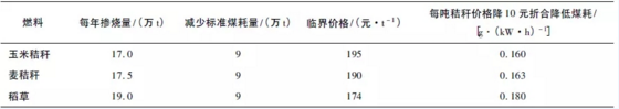 托電公司2013年標(biāo)煤價(jià)格約為370元/t,則只要玉米秸稈價(jià)格低于195元/t,摻燒就能產(chǎn)生經(jīng)濟(jì)效益。各種生物質(zhì)燃料摻燒情況統(tǒng)計(jì)見(jiàn)表2(以1%能量比例摻燒)。