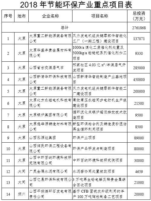 《山西省節(jié)能環(huán)保產(chǎn)業(yè)2018年行動計劃》附環(huán)保產(chǎn)業(yè)重點項目表