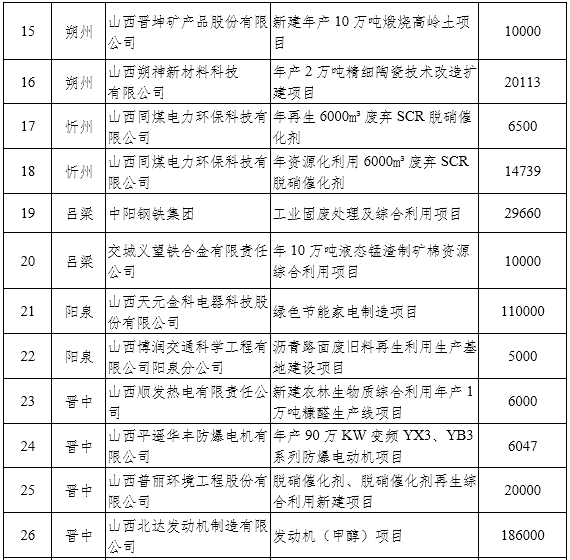 在節(jié)能環(huán)保裝備制造方面,重點推進太原重工新能源裝備有限公司風(fēng)力發(fā)電機組關(guān)鍵零部件智能工廠建設(shè)項目、原鍋爐集團有限公司循環(huán)流化床鍋爐超低排放技術(shù)改造、山西平遙華豐防爆電機有限公司YB3節(jié)能高效電機二期項目、山西思諾電氣有限公司節(jié)能環(huán)保高新技術(shù)產(chǎn)品S14-M˙RL系列變壓器技術(shù)改造等項目;在節(jié)能技術(shù)推廣方面,重點推進山西易通環(huán)能科技集團有限公司100萬平方米/年節(jié)能蓄熱電采暖技術(shù)推廣應(yīng)用建設(shè)等項目;在環(huán)保產(chǎn)業(yè)方面,重點推進山西福萬達工業(yè)新材料有限公司霧霾凈化路燈、山西普麗環(huán)境工程股份有限公司脫硝催化劑、脫硝催化劑再生綜合利用等項目;在資源綜合利用方面,重點推進山西平朔煤矸石發(fā)電有限責(zé)任公司基于CFB固硫灰升級利用的年產(chǎn)100萬噸陶粒制備工藝等項目;在節(jié)能環(huán)保服務(wù)方面,重點推進同煤電力環(huán)保科技有限公司年資源化利用6000m3廢棄SCR脫硝催化劑、山西國科節(jié)能有限公司晉能長治熱電有限公司供熱系統(tǒng)增容改造等項目。(3月底前啟動項目申報工作,按照委內(nèi)要求在年內(nèi)完成相關(guān)工作。)
