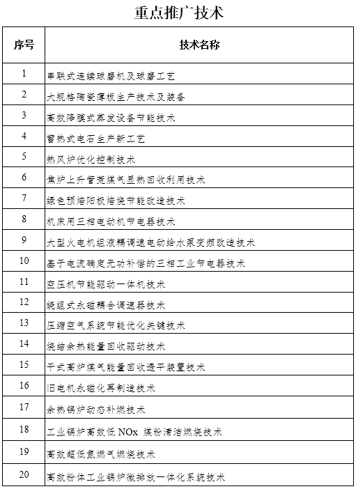 著力攻克節(jié)煤節(jié)電、余熱余壓利用、大氣污染防治、固體廢物處置和資源化利用、礦山治理與土壤修復(fù)等方面的關(guān)鍵共性技術(shù);推進落實國家重點節(jié)能低碳技術(shù)推廣目錄,圍繞煤炭、電力、冶金、化工、焦化、建材等工業(yè)重點領(lǐng)域,出臺山西省重點節(jié)能技術(shù)推廣目錄。重點推廣串聯(lián)式連續(xù)球磨機及球磨工藝、大規(guī)格陶瓷薄板生產(chǎn)技術(shù)及裝備、高效降膜式蒸發(fā)設(shè)備節(jié)能技術(shù)、蓄熱式電石生產(chǎn)新工藝、熱風(fēng)爐優(yōu)化控制技術(shù)、焦?fàn)t上升管荒煤氣顯熱回收利用技術(shù)、機床用三相電動機節(jié)電器技術(shù)、空壓機節(jié)能驅(qū)動一體機技術(shù)、燒結(jié)余熱能量回收驅(qū)動技術(shù)、干式高爐煤氣能量回收透平裝置技術(shù)、余熱鍋爐動態(tài)補燃技術(shù)等20項技術(shù)。(6月底前,組織申報我省先進適用節(jié)能技術(shù),12月底前出臺山西省重點節(jié)能技術(shù)推廣目錄。)