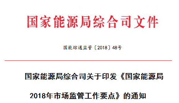 國家能源局綜合司關(guān)于印發(fā)《國家能源局2018年市場監(jiān)管工作要點》的通知