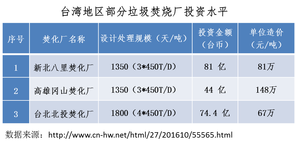 相較于目前大陸地區(qū)采用爐排爐工藝的垃圾焚燒電廠的噸投資成本(穩(wěn)定在40-52萬元)1,臺(tái)灣地區(qū)垃圾焚燒廠的單位造價(jià)成本遠(yuǎn)高于大陸地區(qū)平均投資水平。
