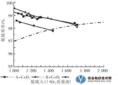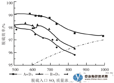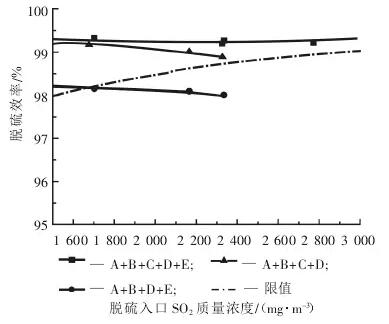 整體脫硫效率A+D>B+D>C+D,在SO2濃度小于700mg/m3時(shí),3種運(yùn)行方式的脫硫效率均能滿(mǎn)足排放要求。