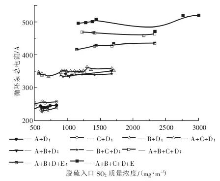 在煙氣脫硫系統(tǒng)FGD(flue gas desulfurization)入口SO2濃度處于不同范圍內(nèi)時(shí),分別調(diào)節(jié)循環(huán)泵的數(shù)量和組合方式,根據(jù)在線監(jiān)測(cè)系統(tǒng)記錄各漿液循環(huán)泵運(yùn)行電流以及脫硫系統(tǒng)進(jìn)出口SO2濃度。