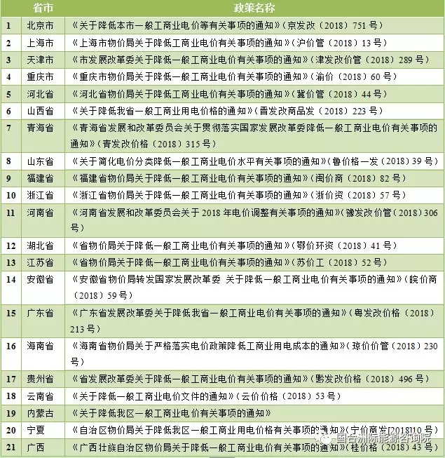 表1已出臺降低一般工商業(yè)電價政策省市一覽表