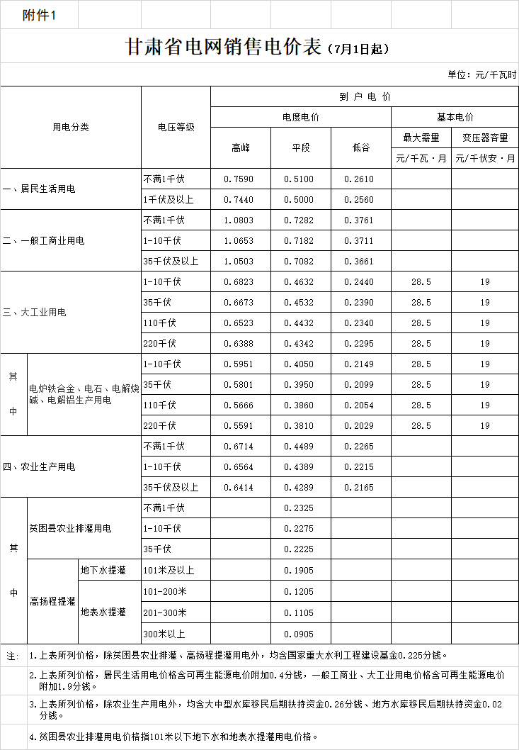附件:1.甘肅省電網(wǎng)銷售電價(jià)表(2018年7月1日起
