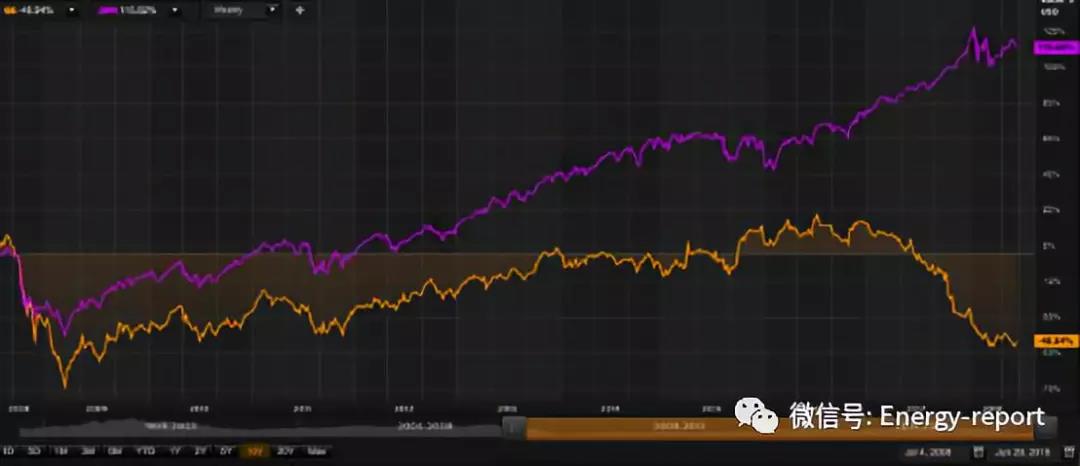 圖5 過去10年通用電氣股價(jià)表現(xiàn)(橙色) vs. 美國標(biāo)準(zhǔn)普爾500指數(shù)(紫色)