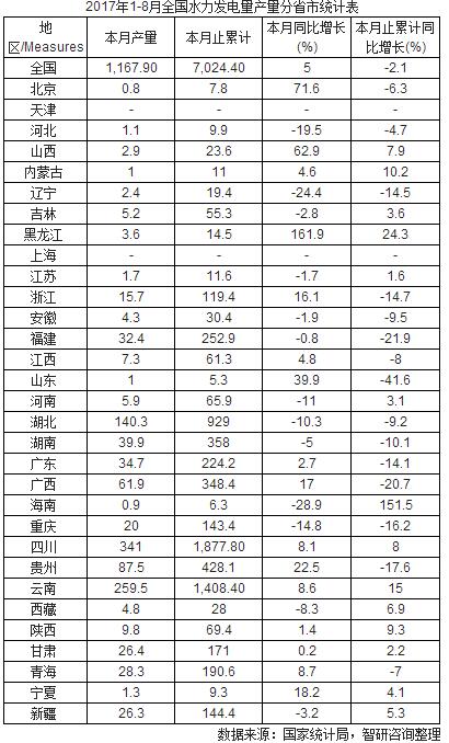 2017年1-8月全國水力發(fā)電量產(chǎn)量分省市統(tǒng)計表