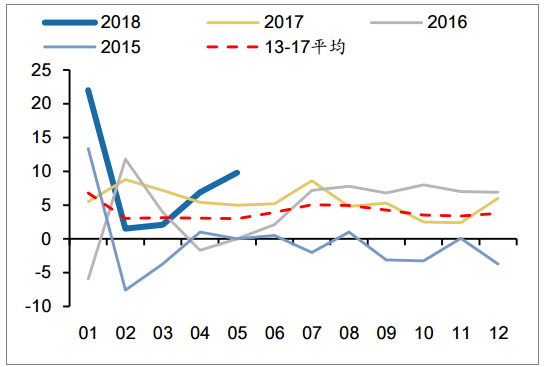 2018年1-5月,全國(guó)火電發(fā)電量同比增長(zhǎng)8.1%(13-17年間平均增速為1.4%),增速較去年 同期增長(zhǎng)0.9個(gè)百分點(diǎn)。5月當(dāng)月發(fā)電量同比增長(zhǎng)10.3%(13-17年間平均增速為1.2%), 增速較去年同期增長(zhǎng)3.8個(gè)百分點(diǎn)。