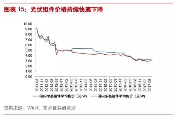 目前多晶及單晶電池效率由2009年的16%和17.5%提高至2016年的19.2%和21%,在光照條件相等情況下,BOS成本、其他組件成本等都與電池效率相關(guān),電池效率每提升1%,每瓦系統(tǒng)成本能降低約5-6%。