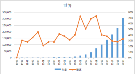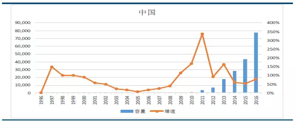 1996-2016年全球太陽能光伏產(chǎn)能(單位:MW)及增速(單位:%)