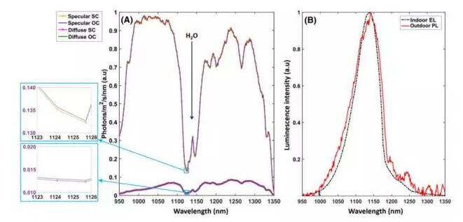 這是另一個(gè)精妙的設(shè)計(jì)。硅的光致發(fā)光,比起環(huán)境太陽(yáng)光弱了太多了,信噪比非常非常低,基本上很難摘出有效信號(hào)來(lái)(PL是有用的,環(huán)境光是沒(méi)有用的)。這也一直以來(lái)是技術(shù)上的難點(diǎn)。為了解決這個(gè)問(wèn)題,研究人員盯上了1110到1170nm這個(gè)波段。在這個(gè)光譜的這個(gè)波段的太陽(yáng)光能量非常低,因?yàn)檫@是大氣中水蒸氣的吸收峰。然而對(duì)于硅材料來(lái)說(shuō),PL發(fā)光可絲毫不受影響。所以在這個(gè)波段的信噪比完全已經(jīng)達(dá)到了能夠精確測(cè)量的程度。這里從室內(nèi)EL和室外PL的信號(hào)比較也可以看的出來(lái)。不得不說(shuō),這也是大自然為戶外光致發(fā)光技術(shù)開(kāi)了一扇窗!