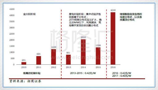 發(fā)改委2016年12月6日發(fā)文表明,2017年1月1日之后,一至三類資源分別調(diào)整為0.65元/0.75元/0.85元,同時表示今后光伏標(biāo)桿電價根據(jù)成本變化情況每年調(diào)整一次。從2015年到2017年光伏標(biāo)桿電價共下調(diào)0.25元/0.2元/0.15元,導(dǎo)致了集中式光伏以0.65元每千瓦的價格對比0.6元以上的成本,利潤變得很薄。而另一方面,分布式由于不占用土地,純并網(wǎng)發(fā)電成本僅為0.55元左右,分布式實行0.42元/kWh的度電補貼政策,這個標(biāo)準(zhǔn)自2013年確定,迄今未做調(diào)整,加上各地還有地方補貼,分布式光伏的補貼力度比起集中式有著天淵之別。隨著陸上風(fēng)電、集中式光伏補貼水平不斷下調(diào),分布式光伏補貼下調(diào)或許未來會到來,而這樣的預(yù)期,將會直接刺激分布式光伏的搶裝熱潮。