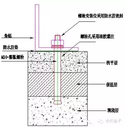 如圖4所示為混凝土屋頂膨脹螺栓與屋面的固定方法和屋面防水措施,孔的直徑需要和膨脹螺栓的直徑匹配,太小和太大都不合適,孔的深度需要根據(jù)屋面的結(jié)構(gòu)來定,膨脹螺栓的深度不允許超出現(xiàn)澆層,一般最大深度為現(xiàn)澆層的一半左右,并以此作為選擇膨脹螺栓長度的依據(jù)。