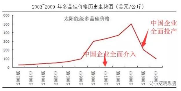 2005年歐洲出臺(tái)高額光伏補(bǔ)貼政策→導(dǎo)致2006年開始多晶硅價(jià)格暴增→導(dǎo)致2007年中國(guó)企業(yè)瘋狂擴(kuò)產(chǎn)多晶硅→導(dǎo)致2011年光伏價(jià)格暴跌→最后生產(chǎn)成本不如中國(guó)企業(yè)的歐美企業(yè),幾乎全軍覆滅。