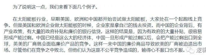所以,這里我就納悶了,歐美企業(yè)憑什么認(rèn)為輸?shù)眯牟环诓环?大家都是拿同樣的補(bǔ)貼,面對(duì)同樣的市場(chǎng)。你自己生產(chǎn)成本高,競(jìng)爭(zhēng)不過中國(guó)企業(yè),就到處為自己失敗找借口,有意思嗎?