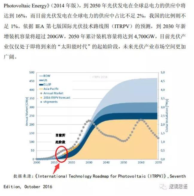 截止2017年,全球光伏累計(jì)裝機(jī)量為403GW。而機(jī)構(gòu)預(yù)測(cè),到2050年光伏累計(jì)裝機(jī)量將達(dá)到4700GW,為現(xiàn)在規(guī)模的十倍!屆時(shí),光伏發(fā)電占全球發(fā)電占比,會(huì)從現(xiàn)在的2%,提高到目前正常發(fā)達(dá)國(guó)家所達(dá)到的16%的水平。