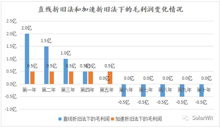 然后我們再用一個圖表更直觀的對比直線折舊法下的毛利潤情況和加速折舊法下的毛利潤情況: