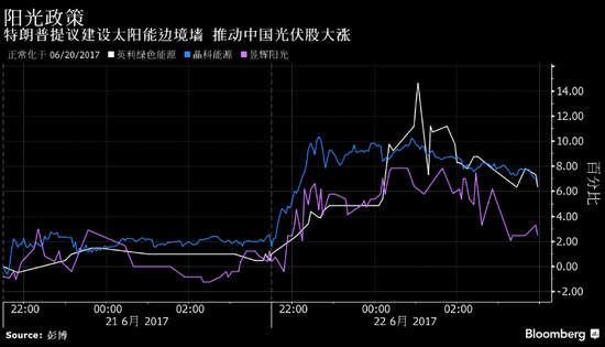 彭博報(bào)道,在美國(guó)總統(tǒng)特朗普提議在擬建中的美墨邊境墻上安裝太陽(yáng)能面板并靠發(fā)電支付建墻費(fèi)用后,中國(guó)光伏類(lèi)股票大漲。英利(2 18, 0 11, 5 31%)綠色能源在紐約上漲5 3%,表現(xiàn)最佳。漲勢(shì)并波及全球太陽(yáng)能股票。中