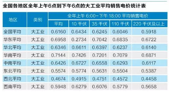 上表是全國(guó)各地區(qū)全年上午6點(diǎn)到下午6點(diǎn)的大工業(yè)平均銷售電價(jià)統(tǒng)計(jì)表。