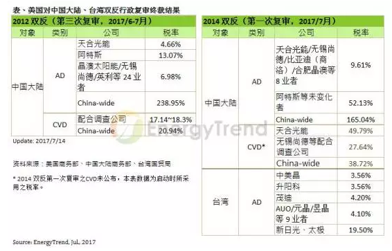 美國(guó)商務(wù)部最新發(fā)布對(duì)中國(guó)大陸與臺(tái)灣光伏電池與組件的雙反行政復(fù)審。集邦咨詢(xún)新能源研究中心(EnergyTrend)分析本次復(fù)審終裁結(jié)果,稅率均較原先版本下降,雖然之前在第三地產(chǎn)能大開(kāi)的情況下,美國(guó)的雙反稅率已無(wú)