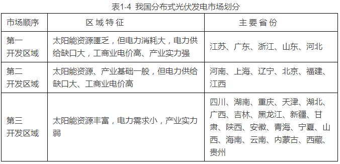 此外,國家和各級政府為了推廣分布式光伏也都陸續(xù)發(fā)布了相應的補貼政策,廣大老百姓已經在政策補貼和環(huán)保意識的驅動下,對分布式光伏發(fā)電從感興趣,想了解到紛紛投資建設,方興未艾,如火如荼。大大小小的光伏企業(yè)也紛紛進入該領域,八仙過海各顯神通,力求分得一塊蛋糕。我國中東部地區(qū)的浙江省、江蘇省、安徽省、山東省等已經成為分布式光伏發(fā)電規(guī)模較大、增長快速的地區(qū),光伏項目從資源更好的西北地區(qū)向中東部轉移,說明電網消納和政策環(huán)境已經成為影響投資決策的更重要因素,也就是說,電力需求規(guī)模越大,電力供給缺口越大,工商業(yè)電價越高,太陽能資源越豐富,太陽能產業(yè)基礎越雄厚,對分布式光伏發(fā)電項目的需求就越大。根據上述規(guī)律,對我國分布式光伏發(fā)電市場的劃分如表1-4所示。