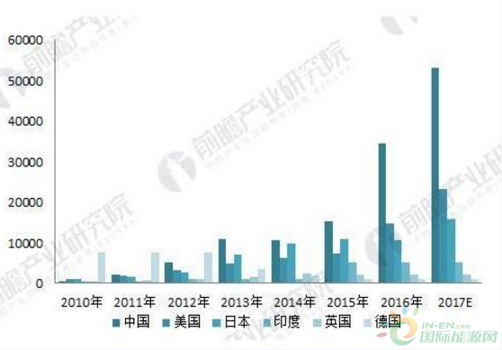 圖表2:2010-2017年全球光伏產(chǎn)業(yè)代表性國家光伏新增裝機容量(單位:MW)