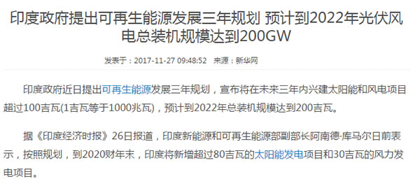 整個(gè)印度,人口和我們中國(guó)不相上下,但其電力總裝機(jī)量在400Gw左右,而我國(guó)的總裝機(jī)量約2000Gw,大家可以想想這個(gè)差距有多大,而這是一個(gè)十分巨大的市場(chǎng)。而光伏在印度,已經(jīng)是最廉價(jià)的能源之一了,同時(shí)印度政府也在2014年的提出了2020年要建造100Gw的光伏電站,同時(shí),也在近期又進(jìn)一步提出在2022年要將光伏與風(fēng)電的總規(guī)模達(dá)到200Gw的目標(biāo):