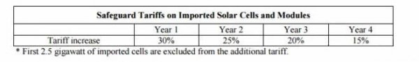 其中,對(duì)進(jìn)口產(chǎn)品的保障關(guān)稅將執(zhí)行4年,首年稅率為30%,隨后年降5%,至2021年稅率將為15%。