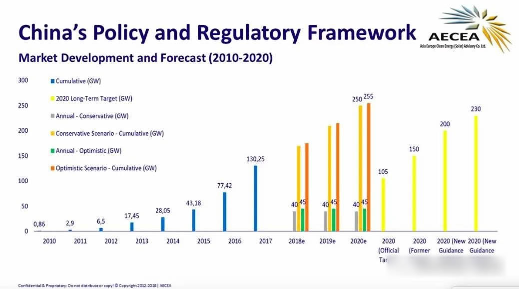中國光伏的發(fā)展速度讓國際社會嘆為觀止:2010年累計裝機(jī)僅為0.86吉瓦,此后實現(xiàn)跳躍式發(fā)展,到2017年已經(jīng)達(dá)到130.25吉瓦。而官方對于2020...