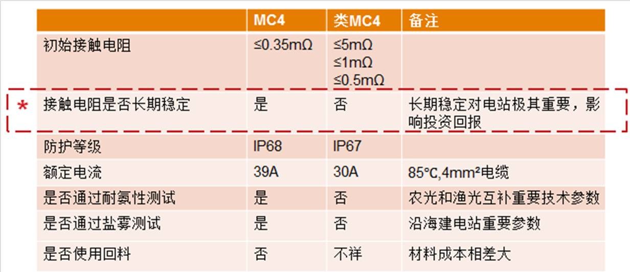“類(lèi)MC4”出于市場(chǎng)原因,宣稱(chēng)可與MC4互插。盡管外形上,看似完成了連接,但是隱形的安全風(fēng)險(xiǎn)已然發(fā)生。不同廠家連接器在規(guī)格、尺寸和公差等方面并不一致,所以根本無(wú)法100%匹配。倘若強(qiáng)行互插,會(huì)導(dǎo)致溫度升高、接觸電阻變化和IP等級(jí)無(wú)法保證的問(wèn)題,進(jìn)而嚴(yán)重影響電阻的發(fā)電效率和安全。