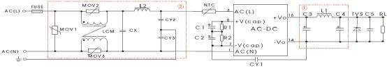 LS03-16BxxSS系列電源,如果需應(yīng)用在電磁環(huán)境比較惡劣的場(chǎng)合中,為使產(chǎn)品工作穩(wěn)定且不被電磁干擾輕易損壞,建議在電源輸入端口增加相應(yīng)的EMC外圍電路,以滿足一定指標(biāo)的電磁兼容性能,如圖(二)所示為推薦電路供參考: