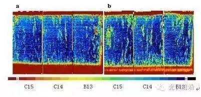 選擇兩個硅錠相同位置硅塊作為檢測樣塊,采用μ-PCD (Semilab, model WT2000)測量對比少子壽命差異,采用在線PL(LTS-R2)測量對比硅片的品質(zhì)區(qū)別,采用EBSD測量對比晶向分布與晶界比例之間的差異。