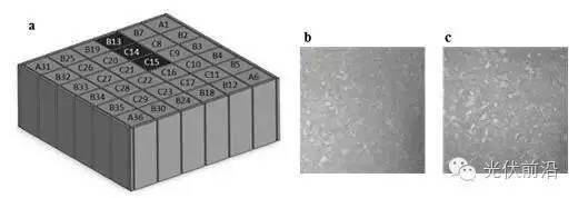 Fig.1.Comparisonof crystalnucleation (a) schematic bricks representation of mc-Si silicon ingot;(b) crystalgrains of brick C15 from the silicon-seeded HP mc ingot horizontalcross section15mm from bottom; (c) crystal grains of brick C15 from thesiliconnitride-seeded HP mc ingot horizontal cross section 15mm from bottom.