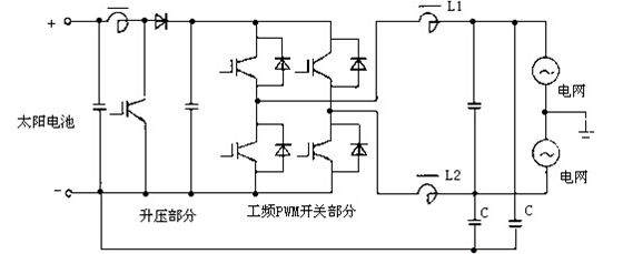 圖1(c)是無變壓器主電路形式,不采用變壓器進行輸入與輸出隔離,只要采取適當(dāng)措施,同樣可保證主電路和控制電路運行的安全性,體積最小,重量輕,而且效率高,成本也較低。主電路包括升壓部分和采用高頻SPWM的逆變部分,比工頻變壓器主電路形式要復(fù)雜,但是適應(yīng)輸入直流電壓范圍寬,有利于與太陽能電池進行匹配。盡管由于天氣等因素使太陽能電池輸出電壓發(fā)生變化,但有了升壓部分,可以保證逆變部分輸入電壓比較穩(wěn)定。將成為今后主要的主電路流行方式。
