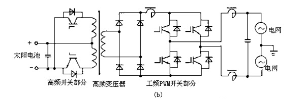 圖1(b)是高頻變壓器主電路形式,采用高頻變壓器使輸入與輸出隔離,體積小,重量輕。主電路分為高頻逆變和工頻逆變兩部分,比較復(fù)雜,是20世紀90年代比較流行的主電路方式。