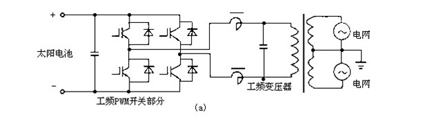 太陽能電池一般是電壓源,因此逆變器的主電路采用電壓型,太陽能光伏發(fā)電系統(tǒng)用逆變器的三種主電路形式如圖1所示。圖1(a)是采用工頻變壓器主電路形式,采用工頻變壓器使輸入與輸出隔離,主電路和控制電路簡單。為了追求效率,減少空載損耗,工頻變壓器的工作磁通密度選得比較低,因此重量大,約占逆變器的總重量的50%左右,逆變器外形尺寸大,是最早的一種逆變器主要形式。