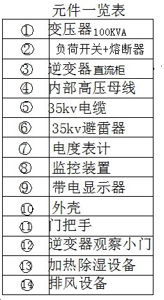 (2)該裝置內(nèi)部結(jié)構(gòu)如下:進(jìn)線為直流線纜,先經(jīng)過逆變器3,轉(zhuǎn)為交流后,接變壓器1低壓側(cè),經(jīng)升壓后,接高壓真空負(fù)荷開關(guān)和熔斷器2、避雷器6,再接出線高壓電纜5;見圖4的剖面圖。