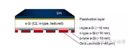 采用IBC與HJ技術(shù)結(jié)合的HIBC技術(shù)可以使電池效率進一步提升,其結(jié)構(gòu)如圖4所示,在硅片表面同時采用本征的非晶硅進行表面鈍化,在背面分別采用N型和P型的非晶硅薄膜形成異質(zhì)結(jié)。其優(yōu)點是利用非晶硅優(yōu)越的表面鈍化性能,并結(jié)合IBC結(jié)構(gòu)沒有金屬遮擋的結(jié)構(gòu)優(yōu)點,采用相同的器件結(jié)構(gòu),日本松下和夏普公司目前取得了25.6%和25.1%的電池效率,這將成為未來IBC電池的重要方向。