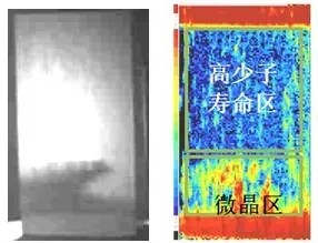 在實驗中首次發(fā)現(xiàn)細小均勻的晶粒具有抑制位錯增殖,減少位錯密度的作用。圖1為鑄造多晶硅塊少子壽命圖與硅塊IR圖。該圖表明細小的晶粒具有抑制位錯增殖,減少位錯的功能。