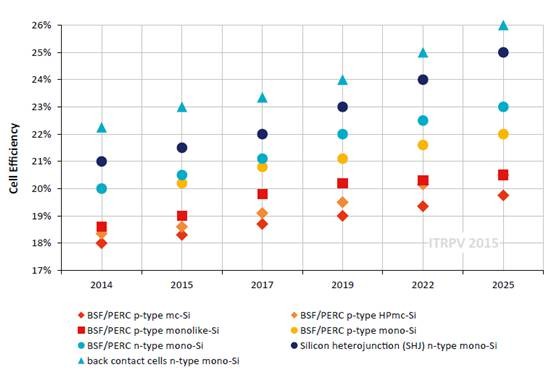 ITRPV預(yù)測,單晶轉(zhuǎn)換效率提升速度與空間遠(yuǎn)高于多晶。