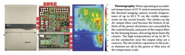 ●采用單層結(jié)構(gòu)的組串式逆變器。Photon于2013年2月公布了國內(nèi)某知名廠家采用強(qiáng)制風(fēng)冷散熱的組串式逆變器測試結(jié)果,機(jī)器內(nèi)部最高溫度點(diǎn)在共模電感(82.3℃)。該廠家的組串式逆變器內(nèi)部采用單層結(jié)構(gòu)設(shè)計(jì),熱成像儀可測得內(nèi)部大部分部件的溫度。