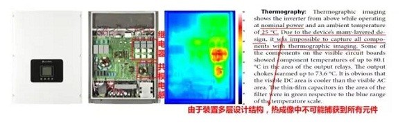 ●采用多層結(jié)構(gòu)設(shè)計(jì)的組串式逆變器,熱成像儀只能測得機(jī)器內(nèi)部部分器件溫度,無法測得所有部件的溫度,如核心器件模塊,電抗等;
