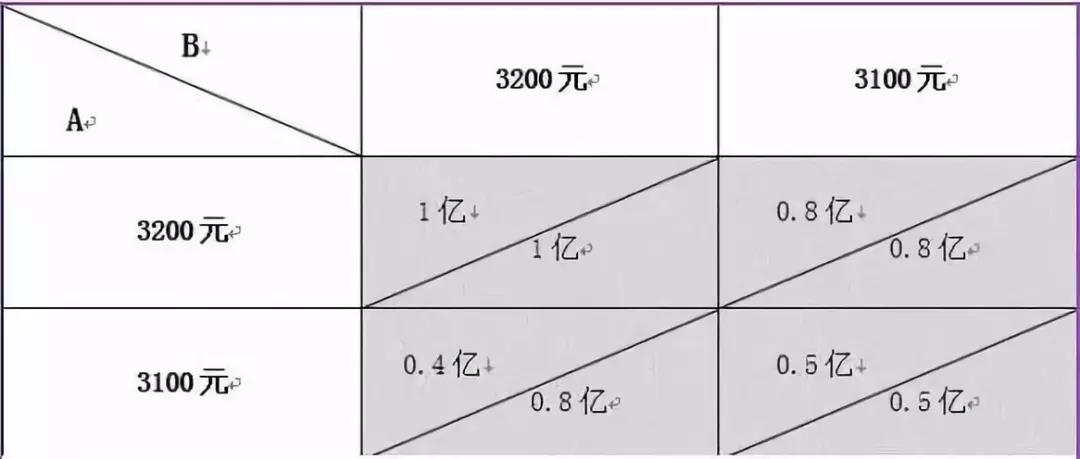 兩家公司還估計(jì)出,如果其中一家公司把價(jià)格降低100元,而另一家的價(jià)格保持不變,那么降價(jià)的公司將額外得到6家客戶就是30萬(wàn)千瓦的容量,而另一家公司將減少6家客戶只能得到4家客戶也就是20萬(wàn)千瓦的中標(biāo)容量。因此每家公司都有動(dòng)機(jī)制定低于對(duì)方公司的價(jià)格,以獲得更多的中標(biāo)容量。我們做出這種假設(shè)的主要目的就是找出這些動(dòng)機(jī)是如何影響雙方的行動(dòng)的。