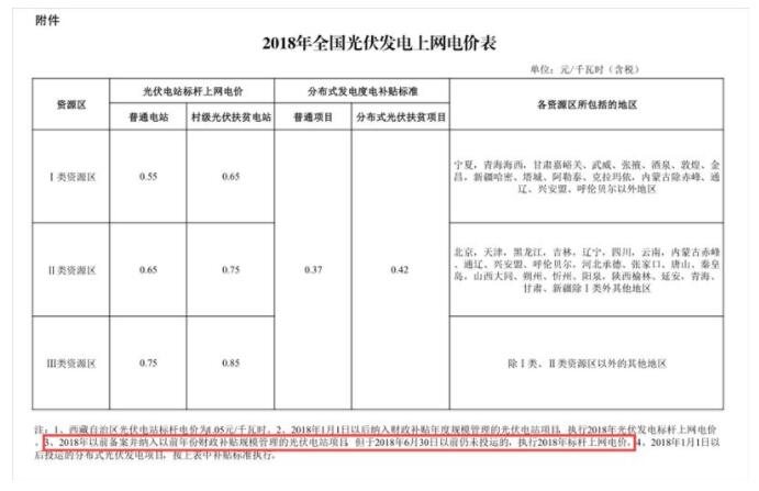 除此之外,國家發(fā)展改革委在2017年12月19日印發(fā)的《關(guān)于2018年光伏發(fā)電項(xiàng)目價(jià)格政策的通知》的文件中也明確,2018年1月1日以后投運(yùn)的分布式光伏發(fā)電項(xiàng)目執(zhí)行2018年新的標(biāo)桿電價(jià)(如下圖所示),即三類資源區(qū)分別對(duì)應(yīng)的是0.55、0.65和0.75元/千瓦時(shí)。因此,即便分布式有630的說法也應(yīng)該是執(zhí)行2018年的標(biāo)桿上網(wǎng)電價(jià)而不是2017年的。